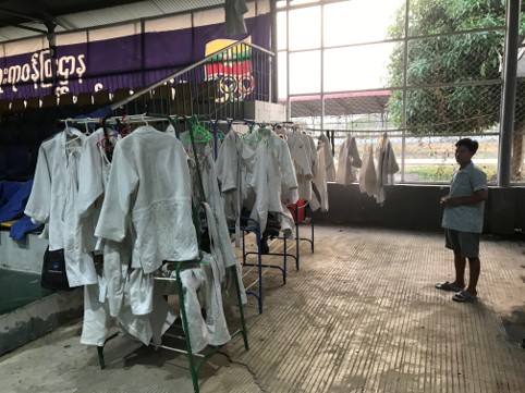 雨漏りのする半屋外の練習場で使用後の柔道衣を干している様子