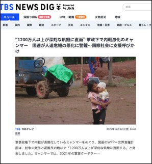 - TBS NEWS DIG powerd byJNN , “1200万人以上が深刻な飢餓に直面” 軍政下で内戦激化のミャンマー 国連が人道危機の悪化に警鐘…国際社会に支援呼びかけ, https://newsdig.tbs.co.jp/articles/-/2344845,2025/12/18閲覧